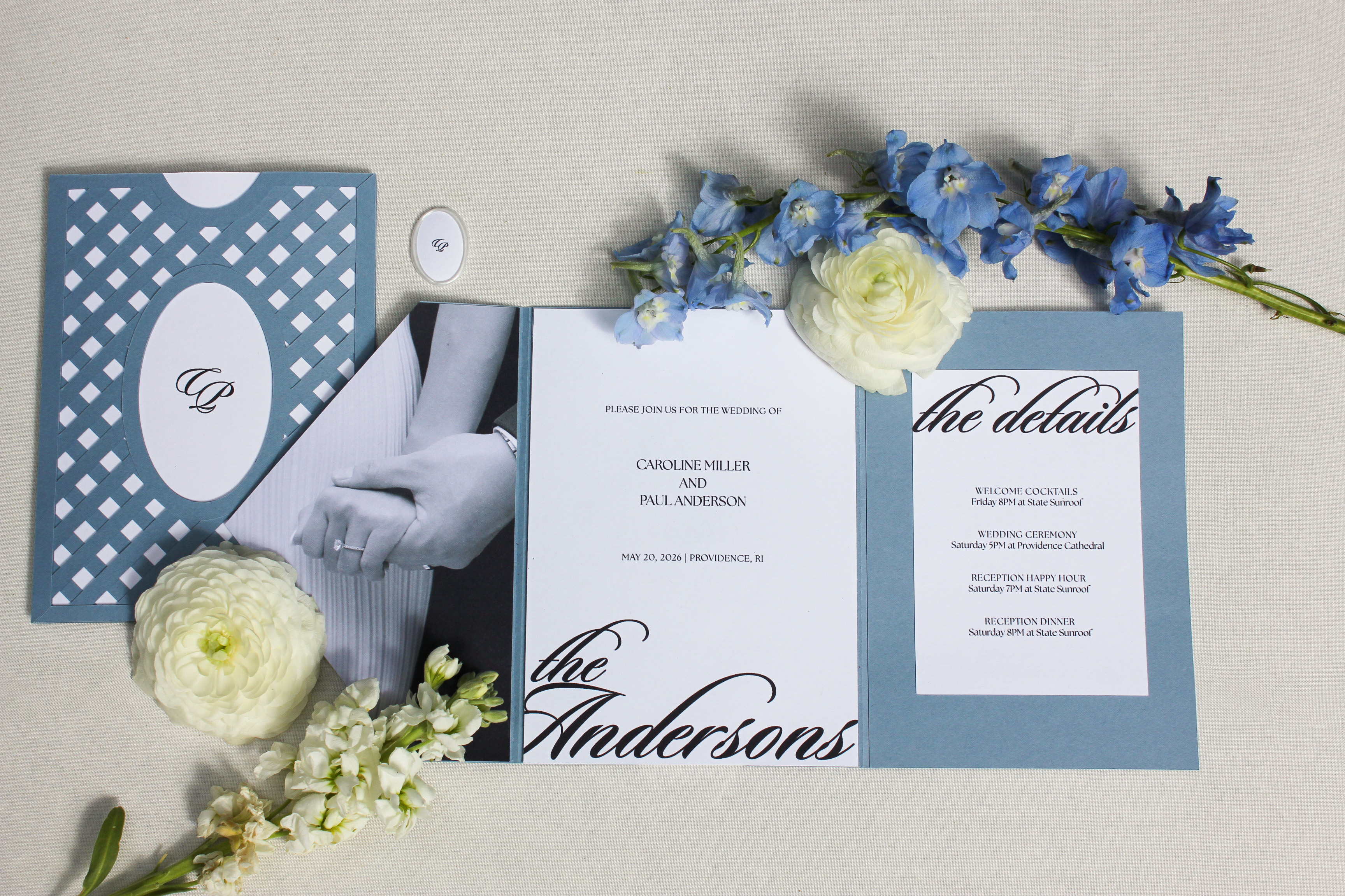 Invitation suite, vow books, ceremony book, tablescape, signage, and more.